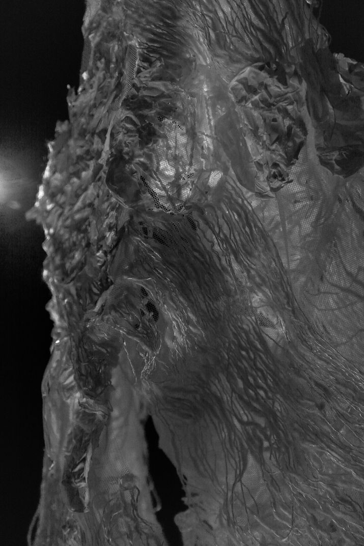 This garment shows the fragility of emptiness. How parts of it rebuild each other while others are falling apart. As if it were a wall that was shattered by physical contact, a skin that sheds and exposes feelings.